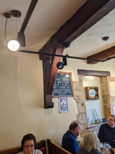 Once we finished perusing through the castle mount and the museum inside the remodled 16th century ducal palace on the site, we happened upon an interesting looking inn and pub. It claims to be "the oldest inn in England." However, it appears that this title is very much in contest between a few places. Still, being built in 1189 certainly grants it the descritption of ancient! We stopped for a drink to enjoy such an old establishment complete with ghost stories and a charming and cavernous interior.